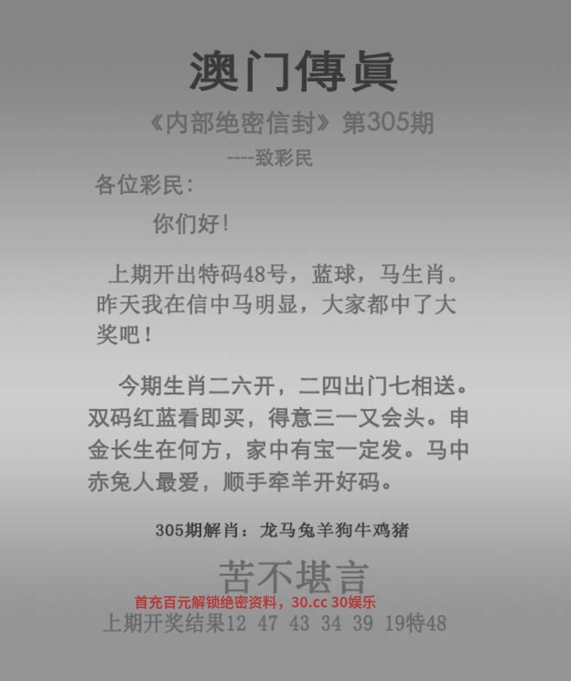 传真305期 今期生肖二六开,二四出门七相送。 双码红蓝看即买,得意三一又会头。 申金长生在何方,家中有宝一定发。 马中赤兔人最爱,顺手牵羊开好码。 苦不堪言 解:今期双码红蓝看即买,解双肖虎鼠狗猴马龙,家中有宝一定发,解家禽生肖牛猪鸡羊狗马。 拐特生肖:羊牛兔马鸡狗猴虎鼠 |