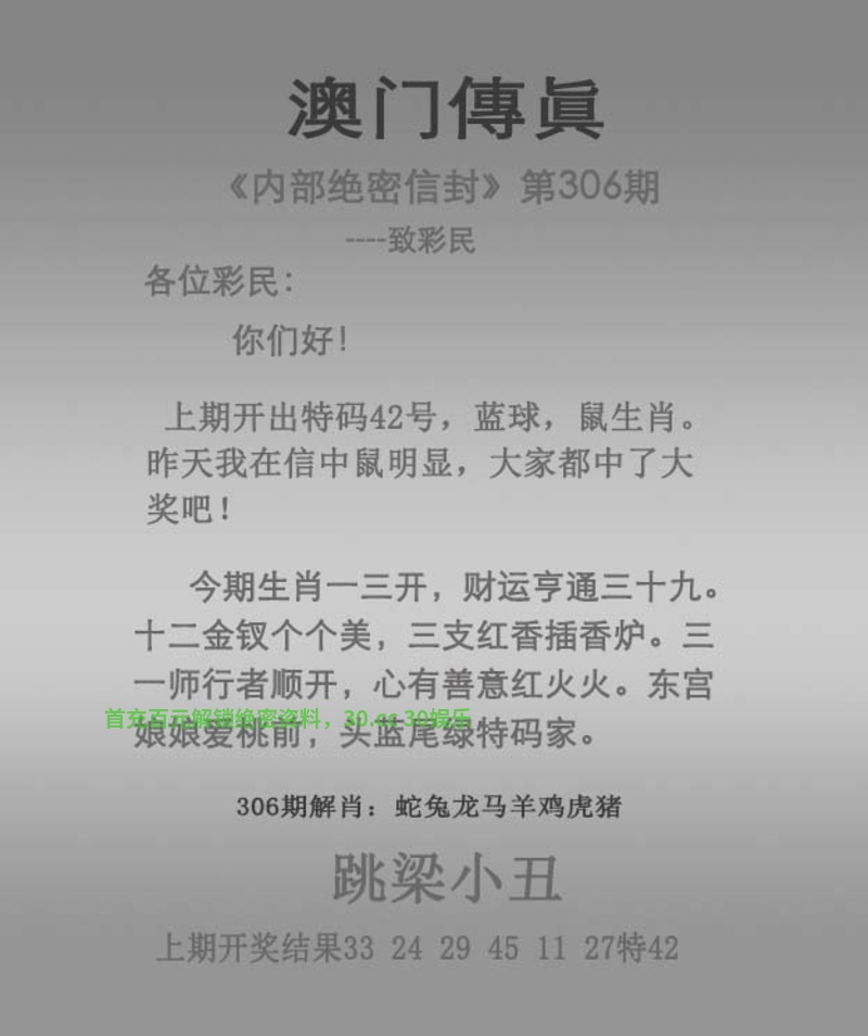 传真306期 今期生肖一三开,财运亨通三十九。 十二金钗个个美,三支红香插香炉。 三一师行者顺开,心有善意红火火。 东宫娘娘爱桃前,头蓝尾绿特码家。 跳梁小丑 解:今期生肖一三开,解单肖兔牛猪鸡羊蛇,东宫娘娘爱桃前,解女肖兔蛇羊鸡猪。 拐特生肖:猴猪虎蛇鸡牛马鼠羊 主特:10.22.19.31.16.28.25.37.21.33.17.29 |